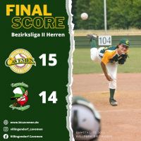 Sie lieferten sich ein spannendes Spiel gegen die Ravensburg Leprechauns und gewannen dieses nur knapp mit 15:14. Coach David Schwarz, möchte neben der guten Leistung des Teams besonders Aaron Weinmann erwähnen, welcher sein Pitcherdebut bei der Herrenmannschaft absolvierte.