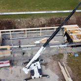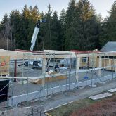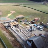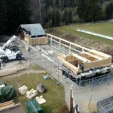Nach langer Vorarbeit in denen sämtliche Wände vorgefertigt wurden und das ganze Baumaterial auf die Baustelle gebracht wurde, ging es dank dem guten Wetter mit dem Hochbau los. Angefangen mit dem Rückbau des vorhandenen Daches des Kiosk wurden anschließend erste Wände gestellt, Stahlstützen eingespannt und Stahlstützen in die Köcherfundamente eingebracht.